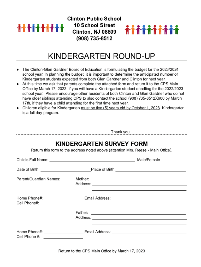 Clinton Public School 10 School Street Clinton, NJ 08809 (908) 7358512KINDERGARTEN ROUNDUP The Clinton Glen Gardner Board of Education is formulating the budget for the 2023/2024 school year. In planning