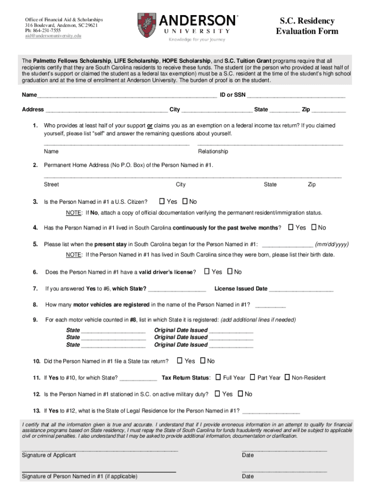 S.C. Residency Evaluation FormOffice of Financial Aid & Scholarships 316 Boulevard, Anderson, SC 29621 pH: 8642317555 aid@andersonuniversity.eduThe Palmetto Fellows Scholarship, LIFE Scholarship,