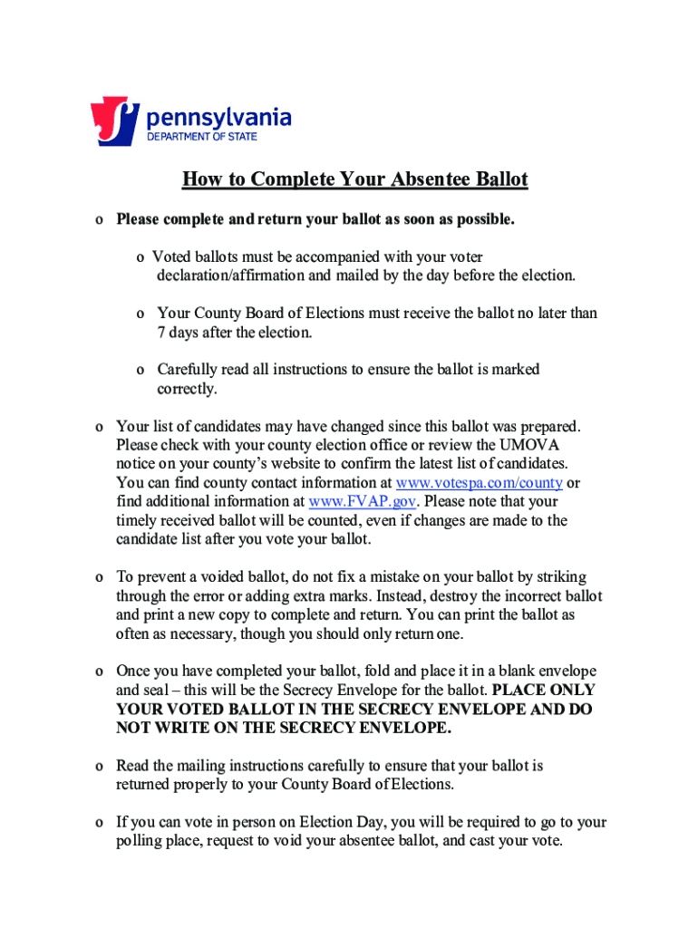 How to Complete Your Absentee Ballot o Please complete and return your ballot as soon as possible. O Voted ballots must be accompanied by your voter declaration/affirmation and mailed by the day before