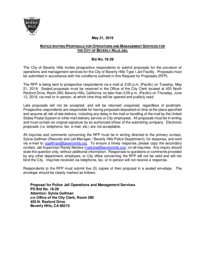 May 21, 2019, NOTICE INVITING PROPOSALS FOR OPERATIONS AND MANAGEMENT SERVICES FOR THE CITY OF BEVERLY HILLS JAIL BID NO. 1929 The City of Beverly Hills invites prospective respondents to submit proposals