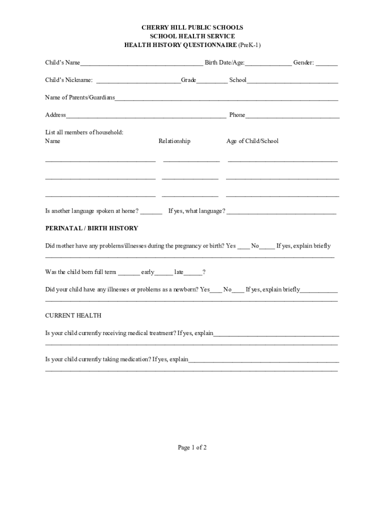 CHERRY HILL PUBLIC SCHOOLS SCHOOL HEALTH SERVICE HEALTH HISTORY QUESTIONNAIRE (PreK1) Child's Name___ Birth Date/Age:___ Gender: ___ Child's Nickname: ___Grade___ School___ Name of Parents/Guardians___