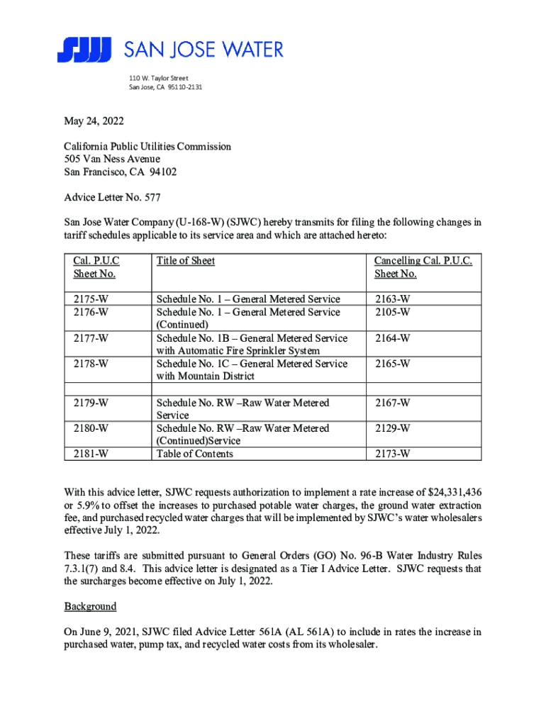 110 W. Taylor Street San Jose, CA 951102131May 24, 2022 California Public Utilities Commission 505 Van Less Avenue San Francisco, CA 94102 Advice Letter No. 577 San Jose Water Company (U168W) (SJW)