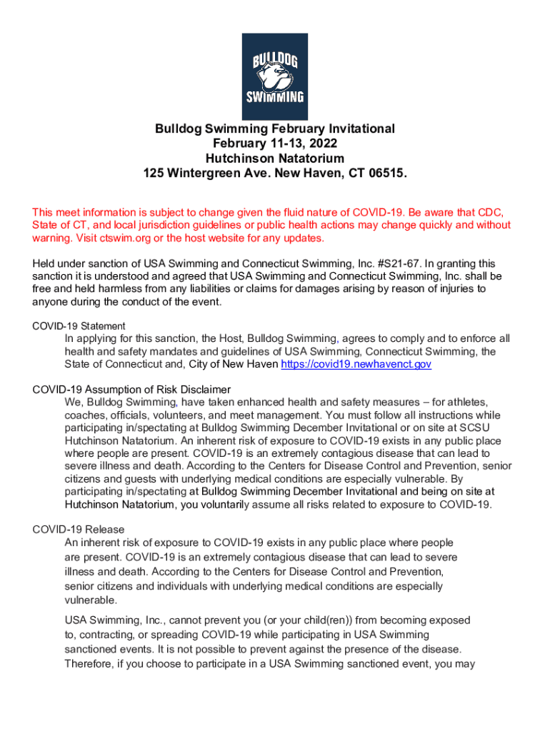 Bulldog Swimming February Invitational February 1113, 2022 Hutchinson Sanatorium 125 Wintergreen Ave. New Haven, CT 06515. This meet information is subject to change given the fluid nature of COVID-19.