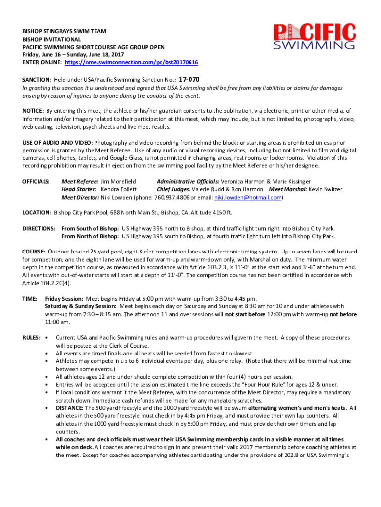 BISHOP STINGRAYS SWIM TEAM BISHOP INVITATIONAL PACIFIC SWIMMING SHORT COURSE AGE GROUP OPEN Friday, June 16 Sunday, June 18, 2017, ENTER ONLINE: https://ome.swimconnection.com/pc/bst20170616 SANCTION: