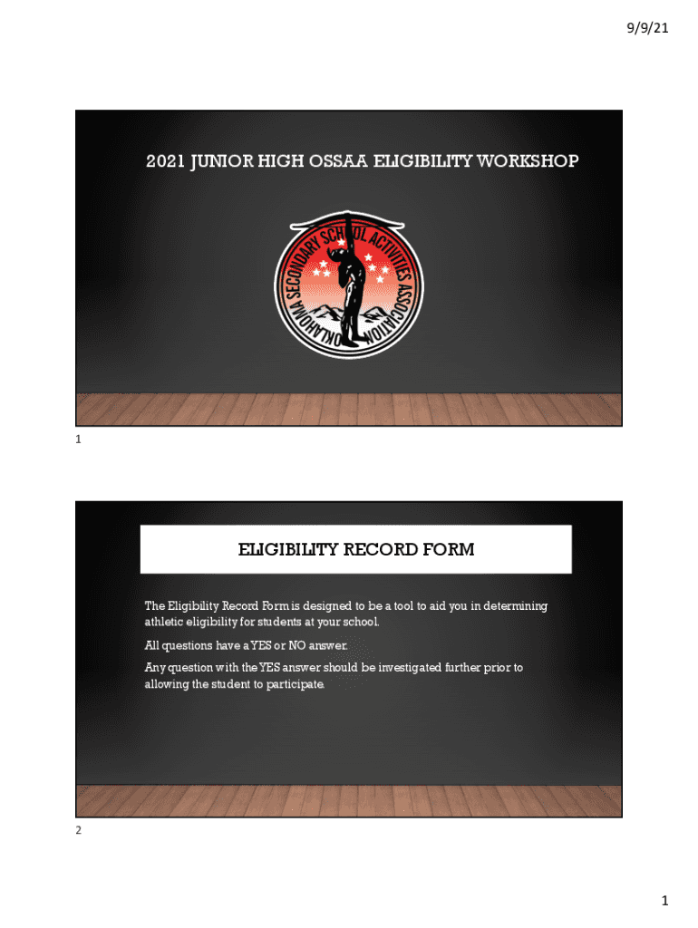 9/9/212021 JUNIOR HIGH OS SAA ELIGIBILITY WORKSHOP1ELIGIBILITY RECORD FORM The Eligibility Record Form is designed to be a tool to aid you in determining athletic eligibility for students at your