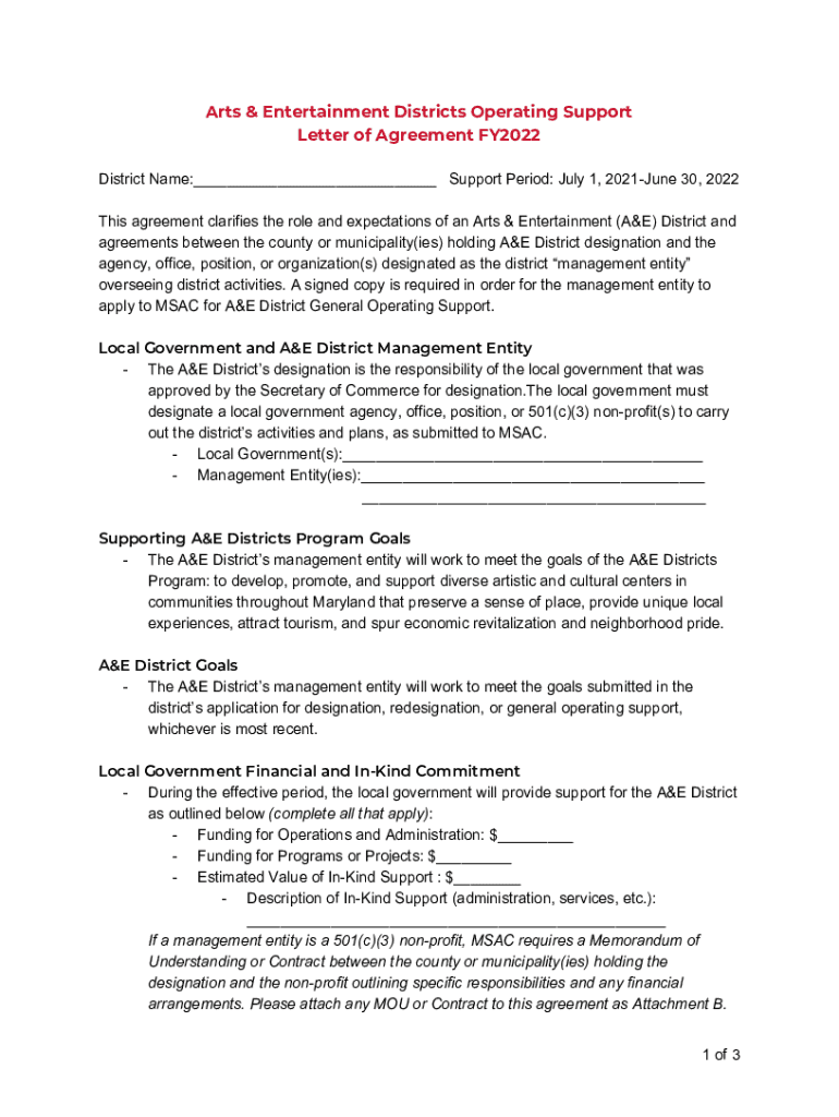 Arts & Entertainment Districts Operating Support Letter of Agreement FY2022 District Name:___ Support Period: July 1, 2021June 30, 2022 This agreement clarifies the role and expectations of an Arts