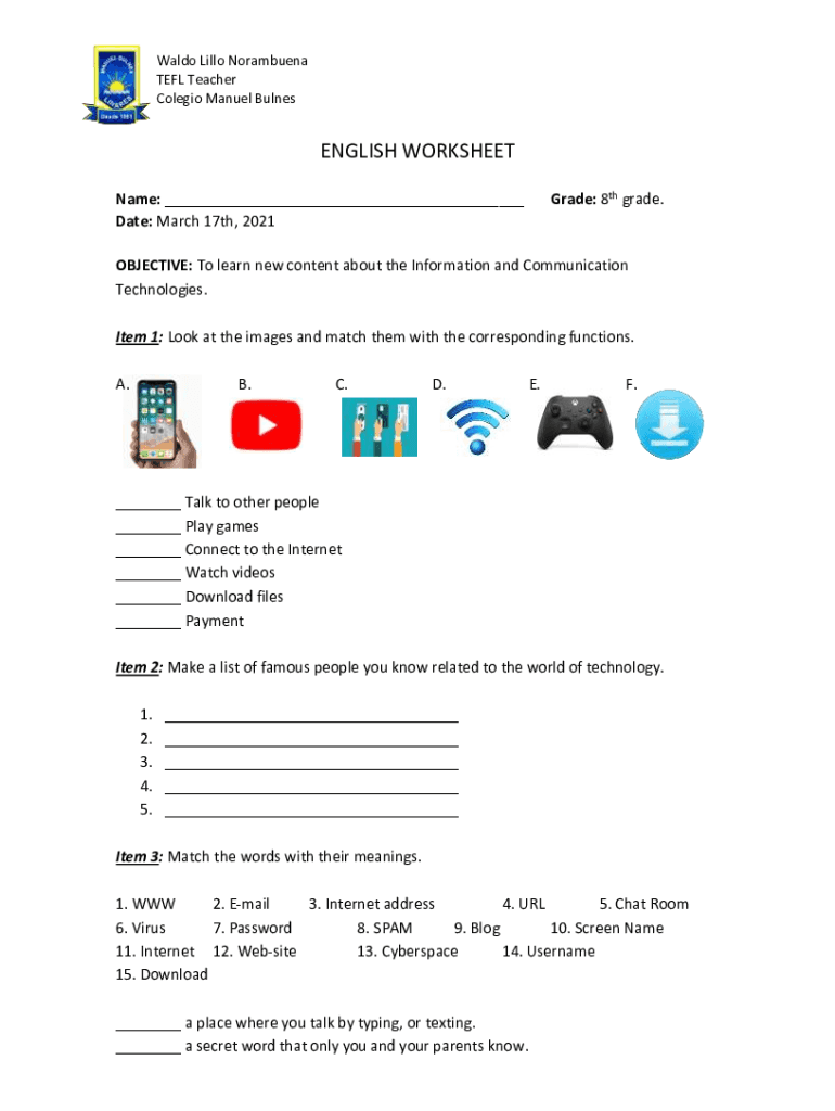 Waldo Lille Norambuena TEFL Teacher Colegio Manuel BulnesENGLISH WORKSHEET Grade: 8th grade. Name: ___ Date: March 17th, 2021OBJECTIVE: To learn new content about the Information and Communication