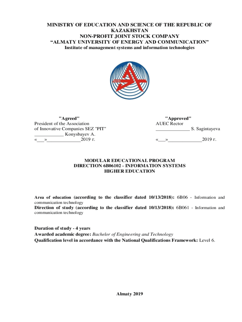MINISTRY OF EDUCATION AND SCIENCE OF THE REPUBLIC OF KAZAKHSTAN NONPROFIT JOINT STOCK COMPANY ALMATY UNIVERSITY OF ENERGY AND COMMUNICATION Institute of management systems and information technologies\”