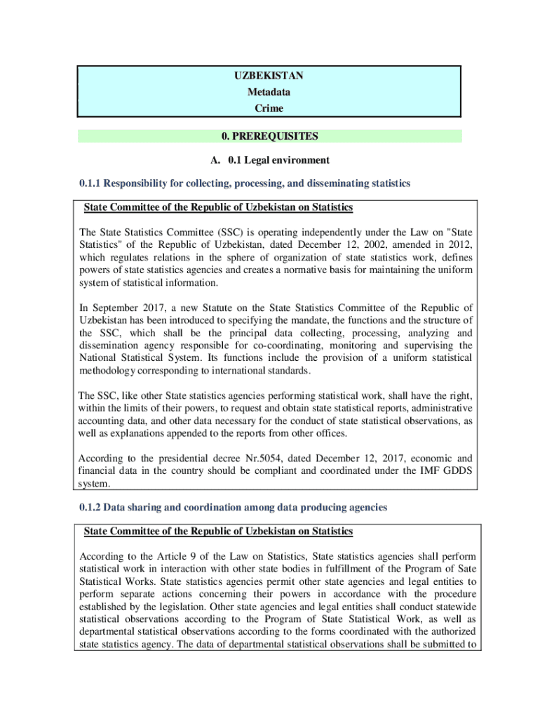 UZBEKISTAN Metadata Crime GODS 0. PREREQUISITES A. 0.1 Legal environment 0.1.1 Responsibility for collecting, processing, and disseminating statistics State Committee of the Republic of Uzbekistan