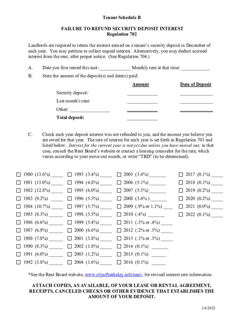 Tenant Schedule B FAILURE TO REFUND SECURITY DEPOSIT INTEREST Regulation 702 Landlords are required to return the interest earned on a tenants' security deposit in December of each year. You may petition