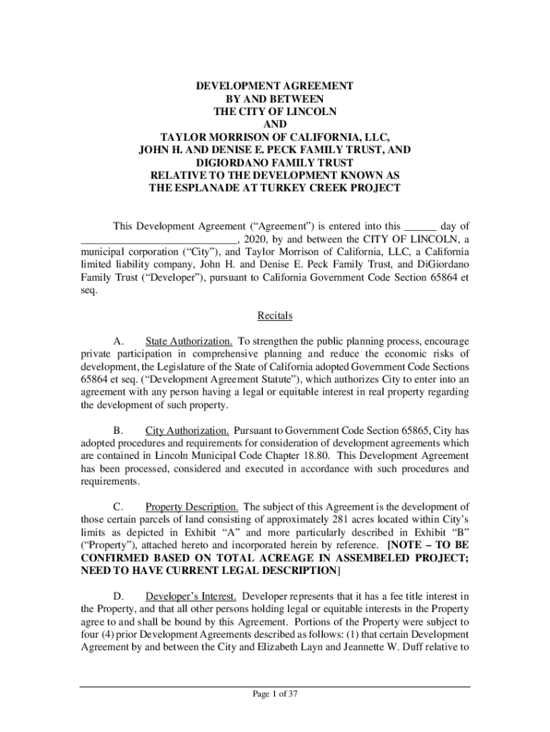DEVELOPMENT AGREEMENT BY AND BETWEEN THE CITY OF LINCOLN AND TAYLOR MORRISON OF CALIFORNIA, LLC, JOHN H. AND DENISE E. PECK FAMILY TRUST, AND GIORDANO FAMILY TRUST RELATIVE TO THE DEVELOPMENT KNOWN