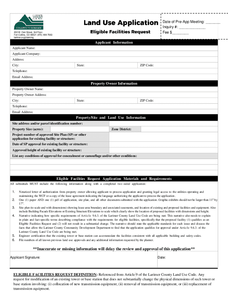 Date of Preamp Meeting: ___ Inquiry #: ___ Fee $___200 W. Oak Street, 3rd Floor, Fort Collins, CO 80521 (970) 4987683 larimer.org/planningApplicant Information Applicant Name: Applicant Company: Address: