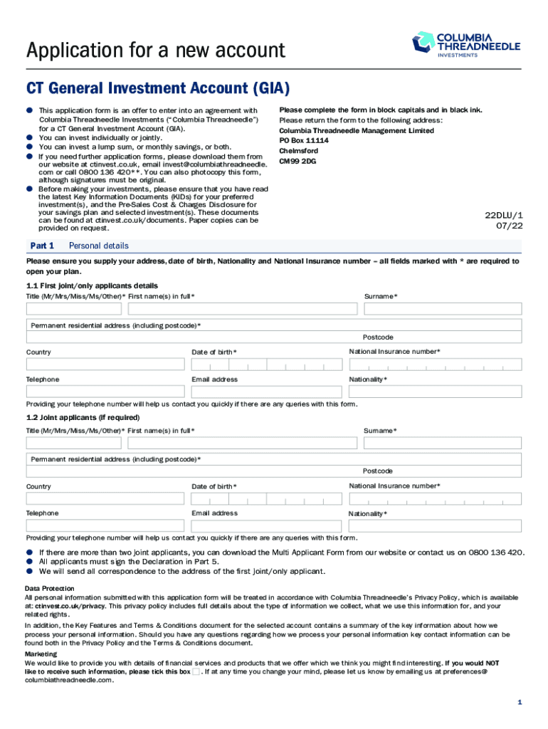 Application for a new account General Investment Account (GIA) This application form is an offer to enter into an agreement with Columbia Thread needle Investments (Columbia Thread needle) for a CT