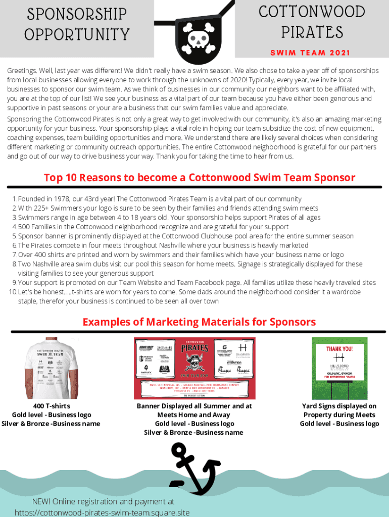 COTTONWOOD PIRATESSPONSORSHIP OPPORTUNITYSWIM TEAM 2021 Greetings. Well, last year was different! We didn't\'t really have a swim season. We also chose to take a year off of sponsorships from local