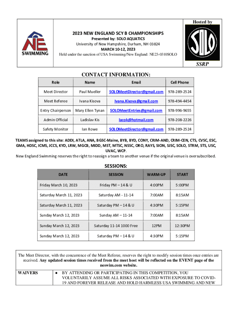 Held under the sanction of USA Swimming/New England: NE230310SOLOSSRP
