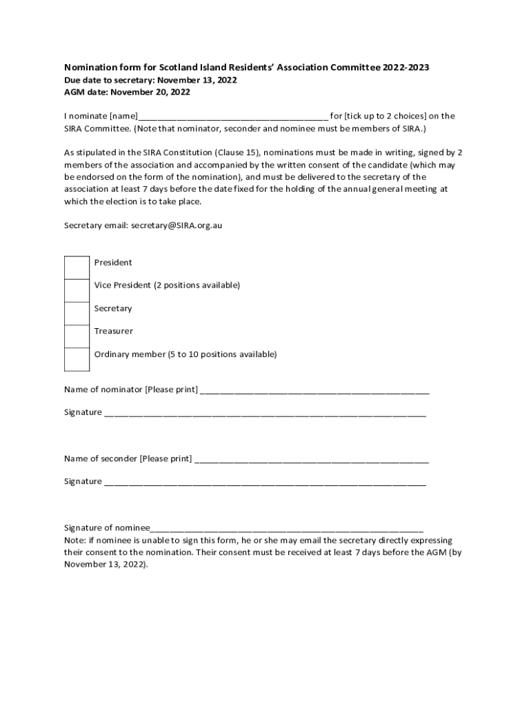 Nomination form for Scotland Island Residents Association Committee 20222023 Due date to secretary: November 13, 2022, AGM date: November 20, 2022, I nominate [name]___ for [tick up to 2 choices]