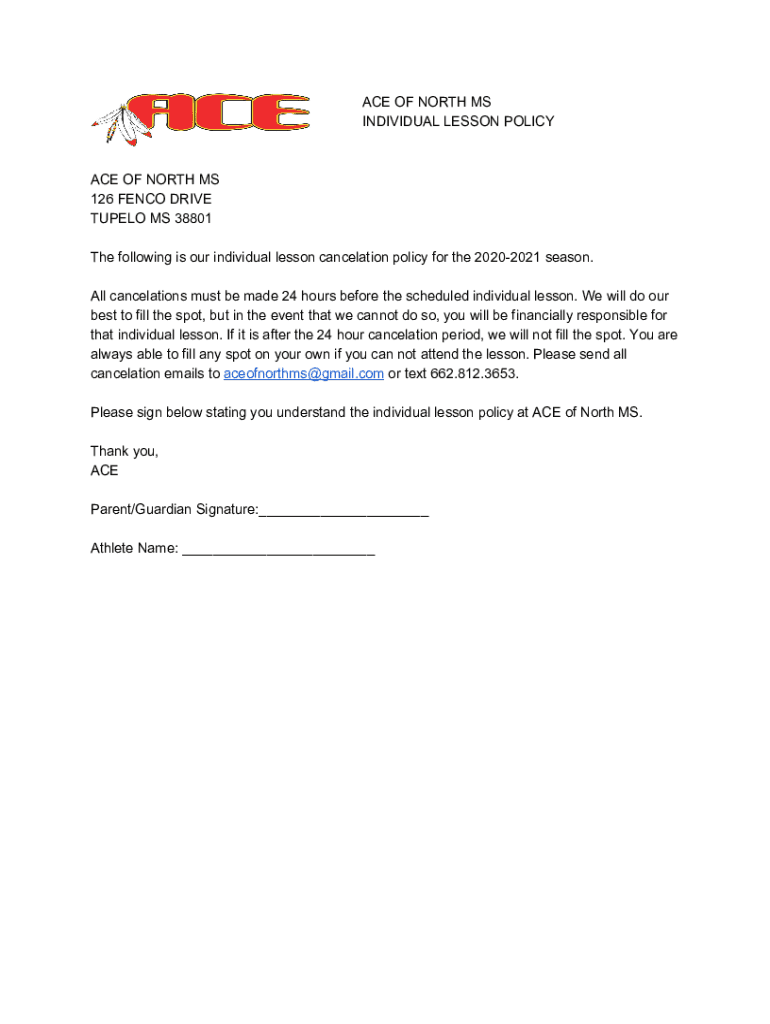 ACE OF NORTH MS INDIVIDUAL LESSON POLICE OF NORTH MS 126 FENCE DRIVE TUPELO MS 38801 The following is our individual lesson cancellation policy for the 20202021 season. All cancellations must be made