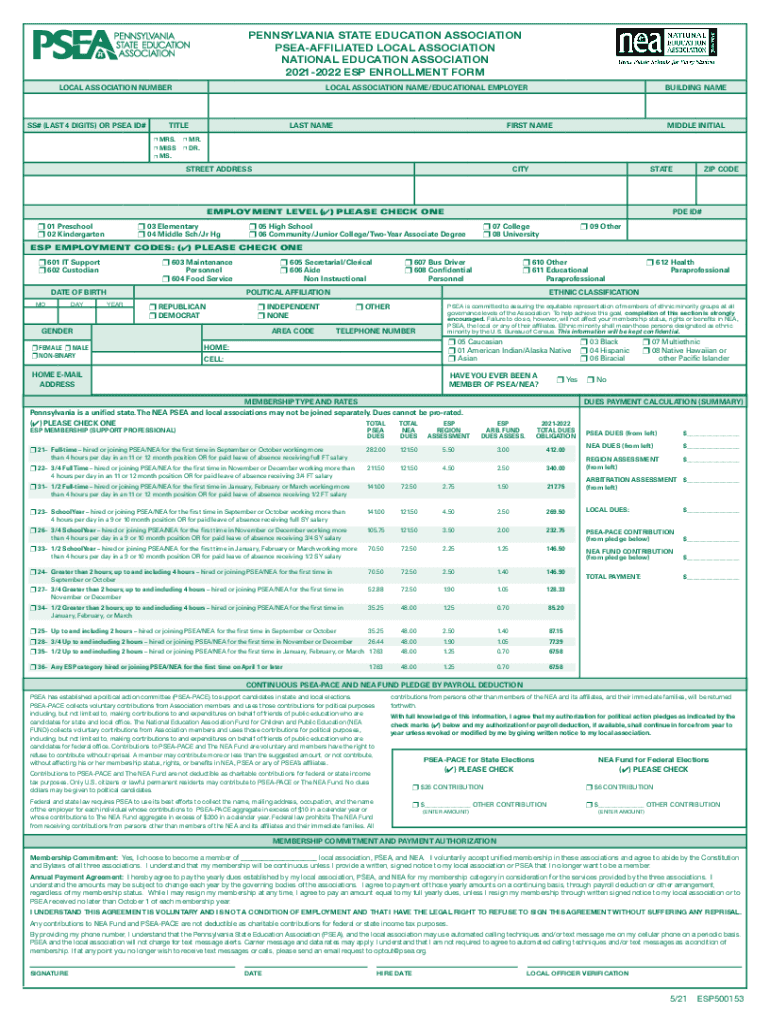 PENNSYLVANIA STATE EDUCATION ASSOCIATION PSEAAFFILIATED LOCAL ASSOCIATION NATIONAL EDUCATION ASSOCIATION 20212022 ESP ENROLLMENT FORM LOCAL ASSOCIATION NUMBERS# (LAST 4 DIGITS) ORP SEA ID#LOCAL ASSOCIATION
