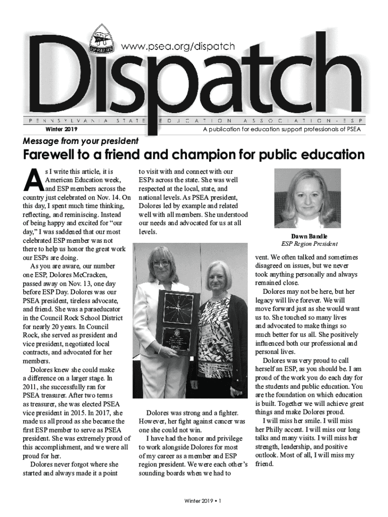 Winter 2019A publication for education support professionals of PSEAMessage from your presidentFarewell to a friend and champion for public educational I write this article, it is American Education