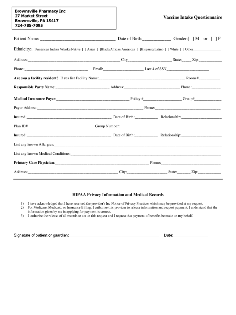 7247857095Vaccine Intake QuestionnairePatient Name: ___ Date of Birth:___ Gender:[ ] M