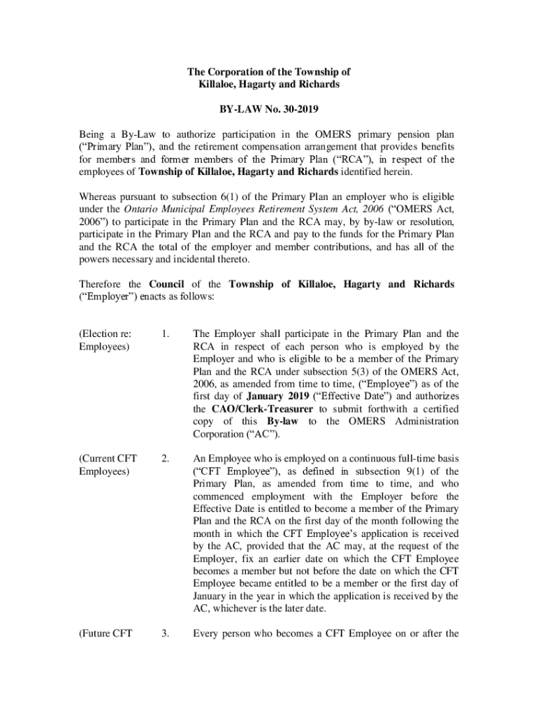 The Corporation of the Township of Kill aloe, Hag arty and Richards BYLAW No. 302019 Being a Bylaw to authorize participation in the HOMERS primary pension plan (Primary Plan), and the retirement