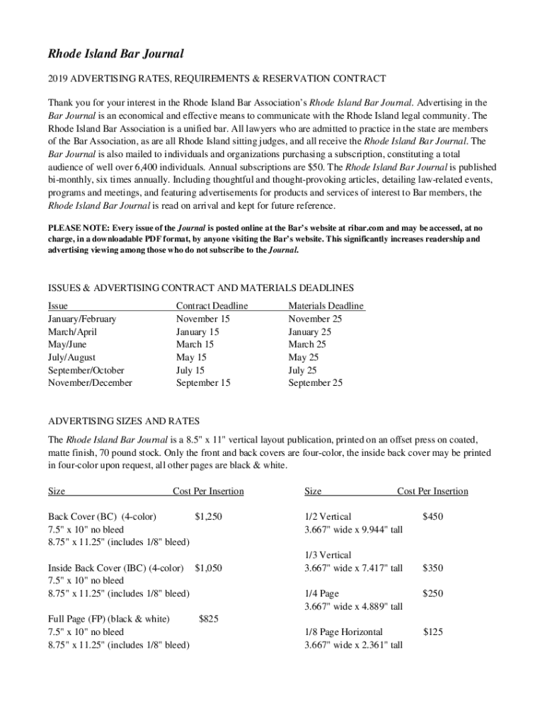 Rhode Island Bar Journal 2019 ADVERTISING RATES, REQUIREMENTS & RESERVATION CONTRACT Thank you for your interest in the Rhode Island Bar Associations Rhode Island Bar Journal. Advertising in the Bar