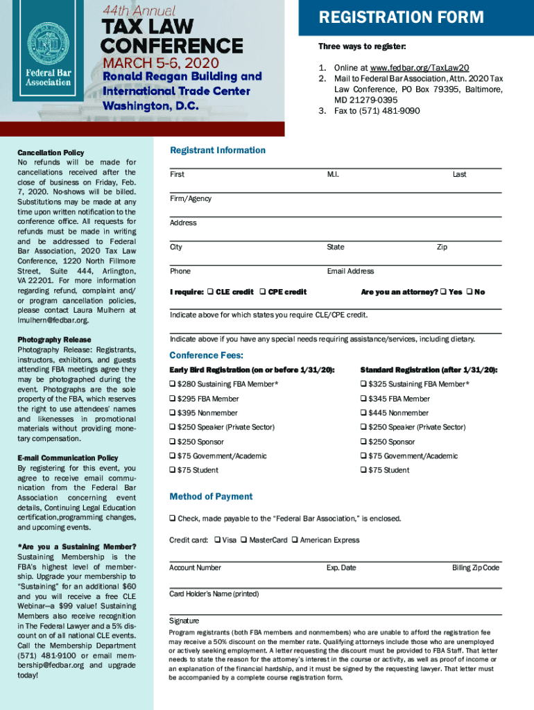 REGISTRATION FORM Three ways to register: 1. Online at www.fedbar.org/TaxLaw20 2. Mail to Federal Bar Association, Attn. 2020 Tax Law Conference, PO Box 79395, Baltimore, MD 212790395 3. Fax to (571)