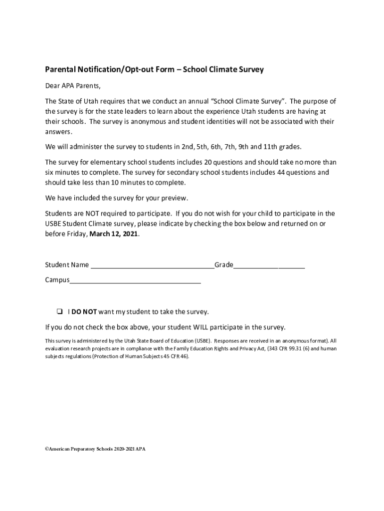 Parental Notification/Op tout Form School Climate Survey Dear APA Parents, The State of Utah requires that we conduct an annual School Climate Survey. The purpose of the survey is for the state leaders