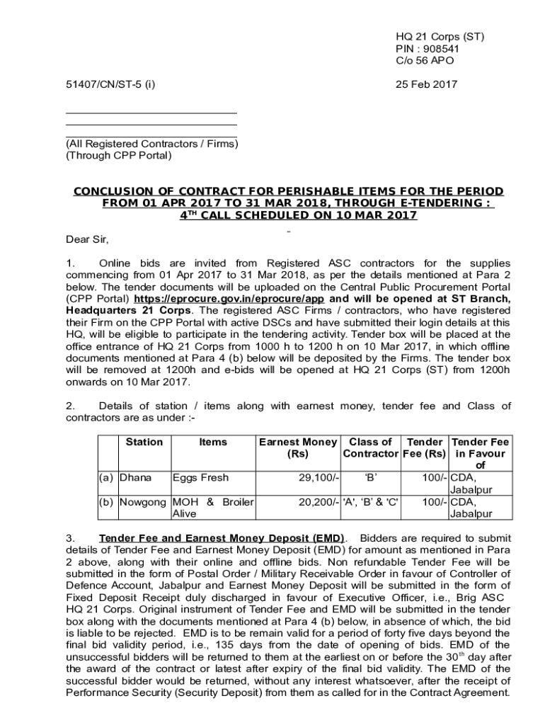 HQ 21 Corps (ST) PIN : 908541 C/o 56 APO 51407/CN/ST5 (i)25 Feb 2017___ ___ ___ (All Registered Contractors / Firms) (Through CPP Portal) CONCLUSION OF CONTRACT FOR PERISHABLE ITEMS FOR THE PERIOD
