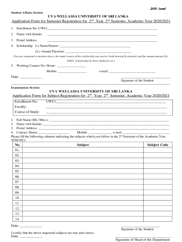 200 Level Student Affairs Section UVA WELLS UNIVERSITY OF SRI LANKAApplication Form for Semester Registration for 2nd Year 2nd Semester, Academic Year 2020/2021 1. Enrollment No: AWU/___ 2. Name with