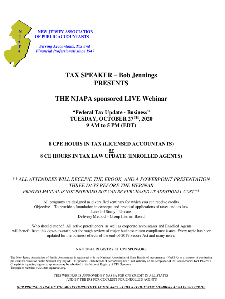 N J A P ANEW JERSEY ASSOCIATION OF PUBLIC ACCOUNTANTS Serving Accountants, Tax and Financial Professionals since 1947TAX SPEAKER Bob Jennings PRESENTS THE NAPA sponsored LIVE Webinar Federal Tax Update