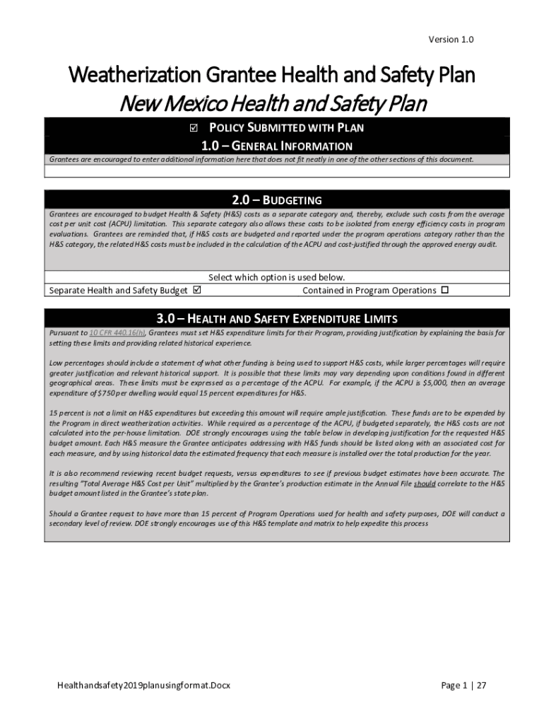 Version 1.0Weatherization Grantee Health and Safety Planned Mexico Health and Safety Plan POLICY SUBMITTED WITH PLAN 1.0 GENERAL INFORMATIONGrantees are encouraged to enter additional information