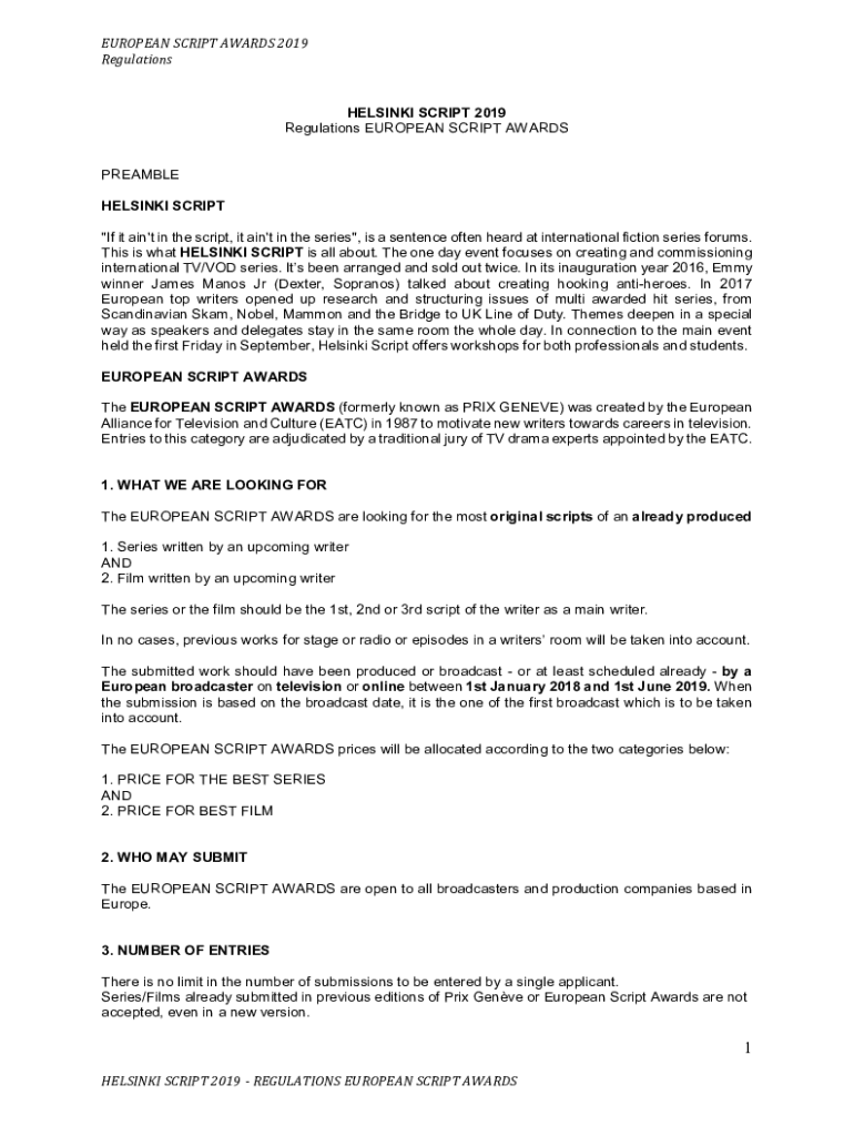 EUROPEAN SCRIPT AWARDS 2019 RegulationsHELSINKI SCRIPT 2019 Regulations EUROPEAN SCRIPT AWARDS PREAMBLE HELSINKI SCRIPT \” If it ain\'t in the script, it ain\'t in the series\”, is a sentence