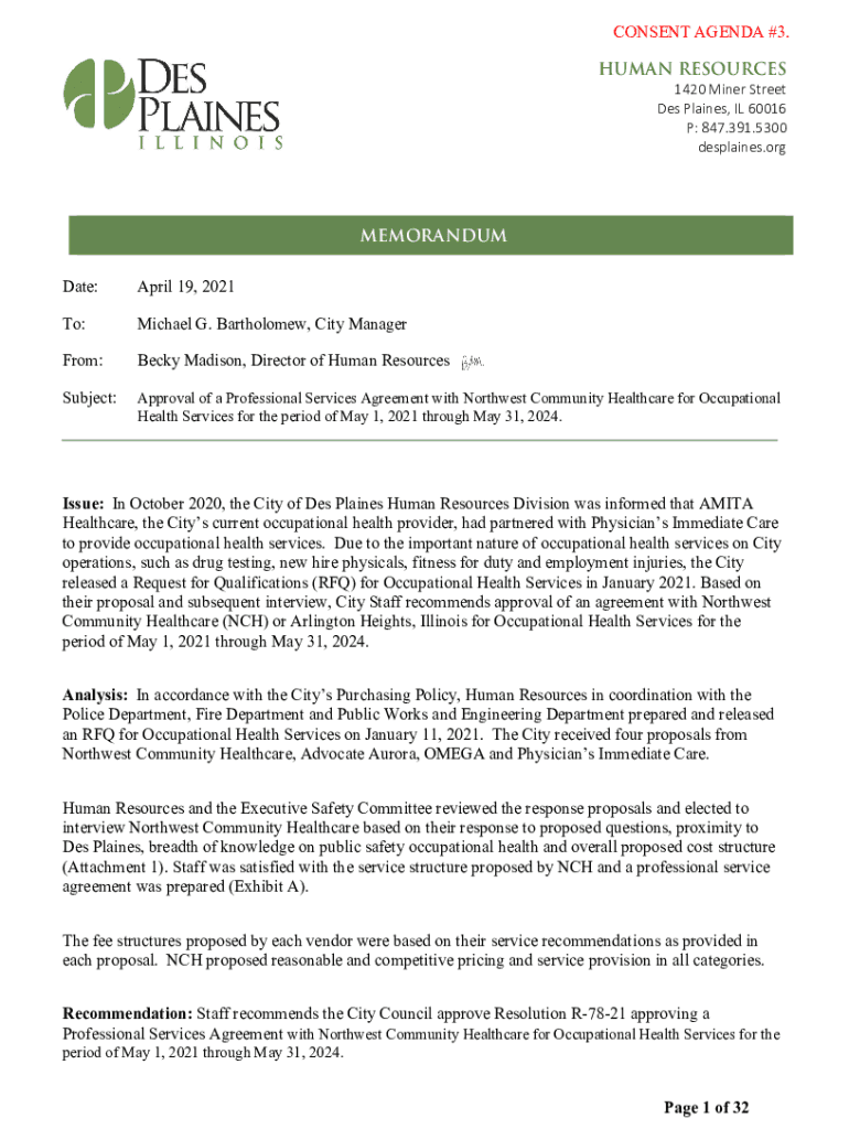 CONSENT AGENDA #3. HUMAN RESOURCES 1420 Miner Street Des Plaines, IL 60016 P: 847.391.5300 deplanes. Memorandum Date:April 19, 2021To:Michael G. Bartholomew, City ManagerFrom:Becky Madison, Director