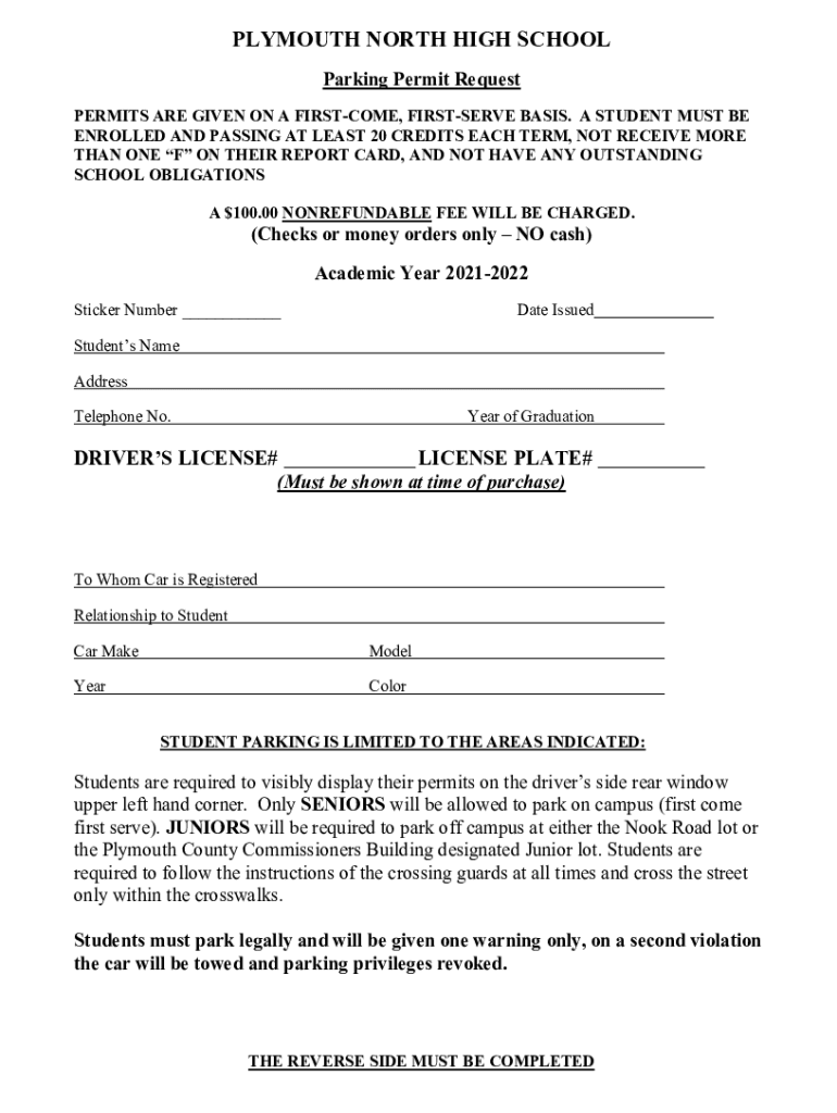 PLYMOUTH NORTH HIGH SCHOOL Parking Permit Request PERMITS ARE GIVEN ON A FIRSTBORN, FIRSTSERVE BASIS. A STUDENT MUST BE ENROLLED AND PASSING AT LEAST 20 CREDITS EACH TERM, NOT RECEIVE MORE THAN ONE