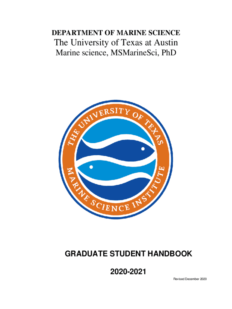DEPARTMENT OF MARINE Science University of Texas at Austin Marine science, MSMarineSci, Graduate STUDENT HANDBOOK 20202021 Revised December 2020I. ORGANIZATION AND ADMINISTRATION OF THE GRADUATE PROGRAM
