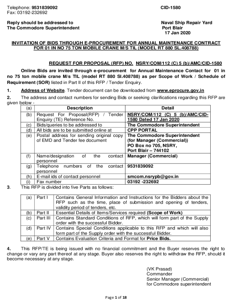 Telephone: 9531839092 Fax: 03192232692CID1580Reply should be addressed to The Commodore SuperintendentNaval Ship Repair Yard Port Blair 17 Jan 2020INVITATION OF BIDS THROUGH PROCUREMENT FOR ANNUAL