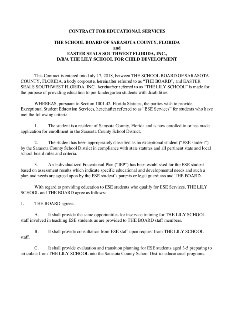 CONTRACT FOR EDUCATIONAL SERVICES THE SCHOOL BOARD OF SARASOTA COUNTY, FLORIDA and EASTER SEALS SOUTHWEST FLORIDA, INC., D/B/A LILY SCHOOL FOR CHILD Developments Contract is entered into July 17,