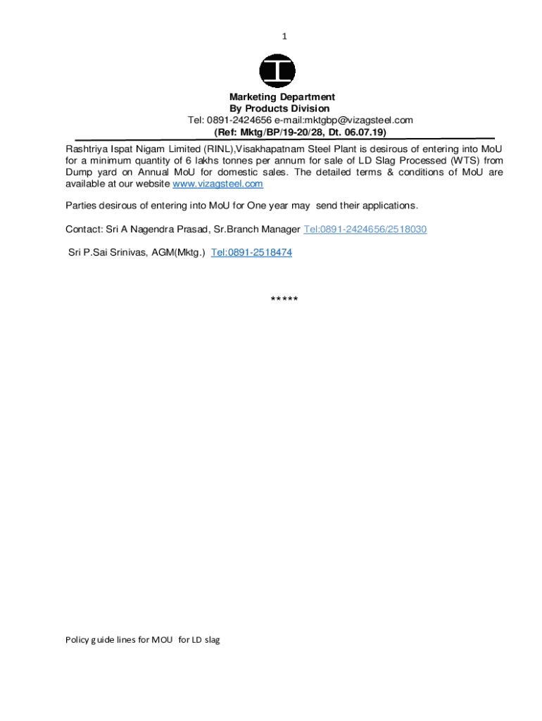 Tel: 08912424656 email:mktgbp@vizagsteel.com