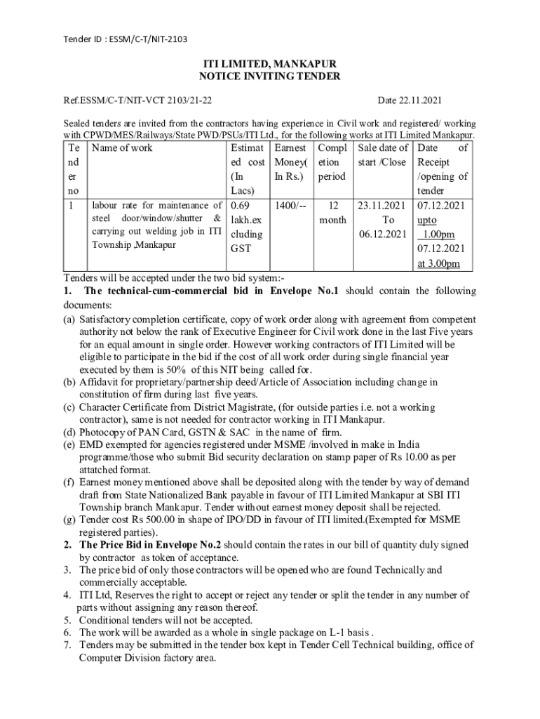 Tender ID : ESS/CT/NIT2103ITI LIMITED, MANIPUR