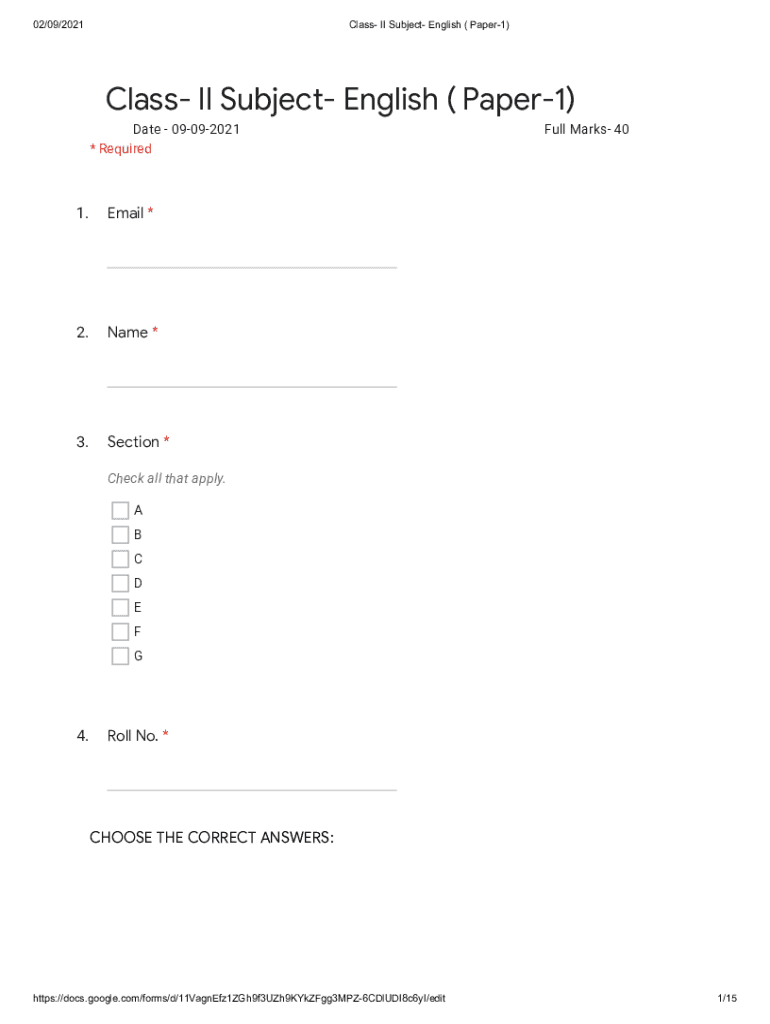 02/09/2021Class II Subject English (Paper1)Class II Subject English (Paper1) Date 09092021 * Required1. Email *2. Name *3. Section *Full Marks 40Check all that apply. A B C D E F G4. Roll No. *CHOOSE
