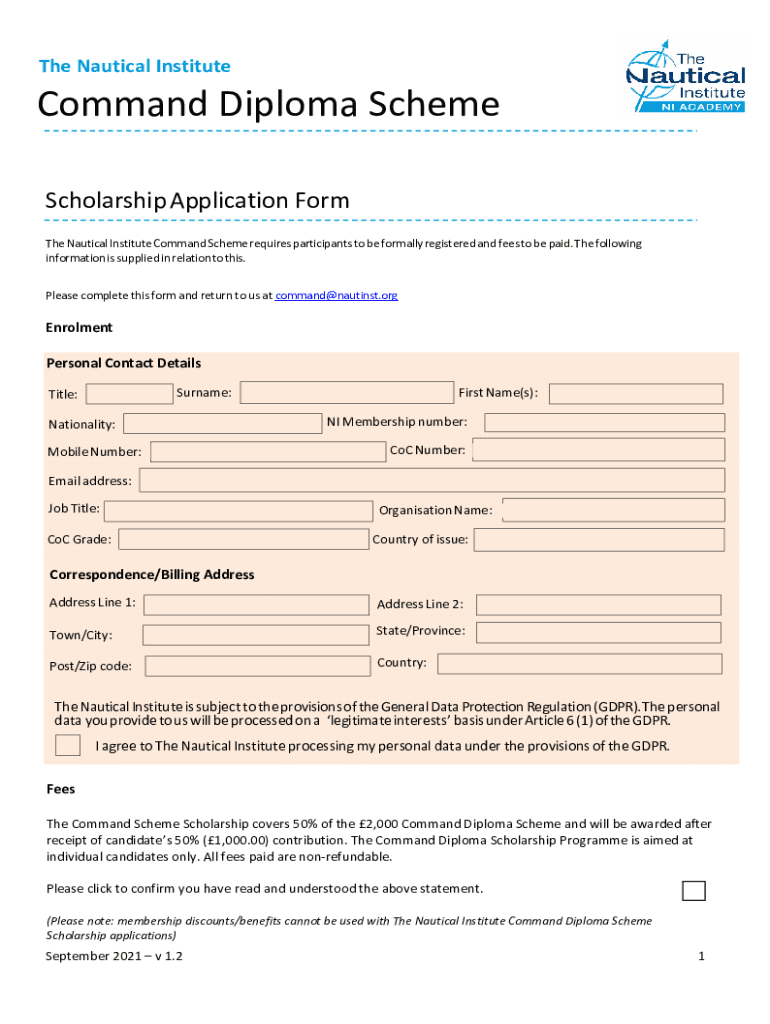 The Nautical InstituteCommand Diploma Scheme Scholarship Application Form The Nautical Institute Command Scheme requires participants to be formally registered and fees to be paid. The following information