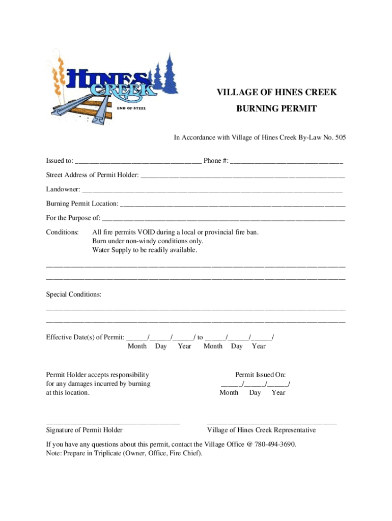 VILLAGE OF HINES CREEK BURNING PERMIT In Accordance with Village of Hines Creek Bylaw No. 505 Issued to: ___ Phone #: ___ Street Address of Permit Holder: ___ Landowner: ___ Burning Permit Location: