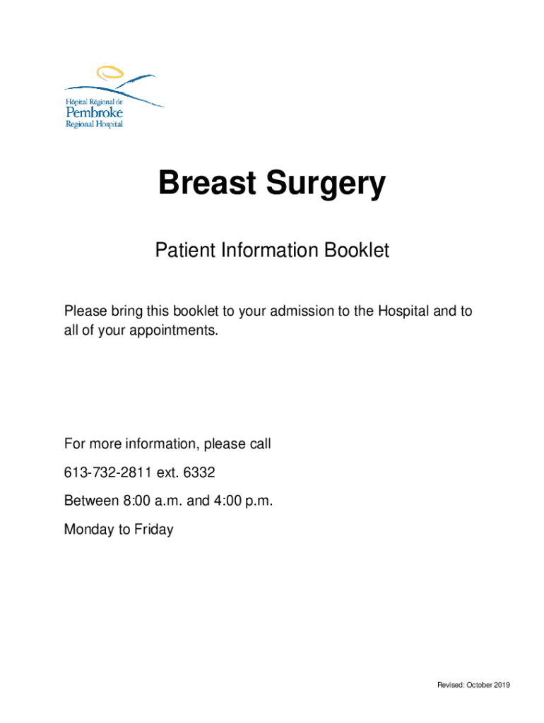 Breast Surgery Patient Information Booklet Please bring this booklet to your admission to the Hospital and to all of your appointments. For more information, please call 6137322811 ext. 6332 Between