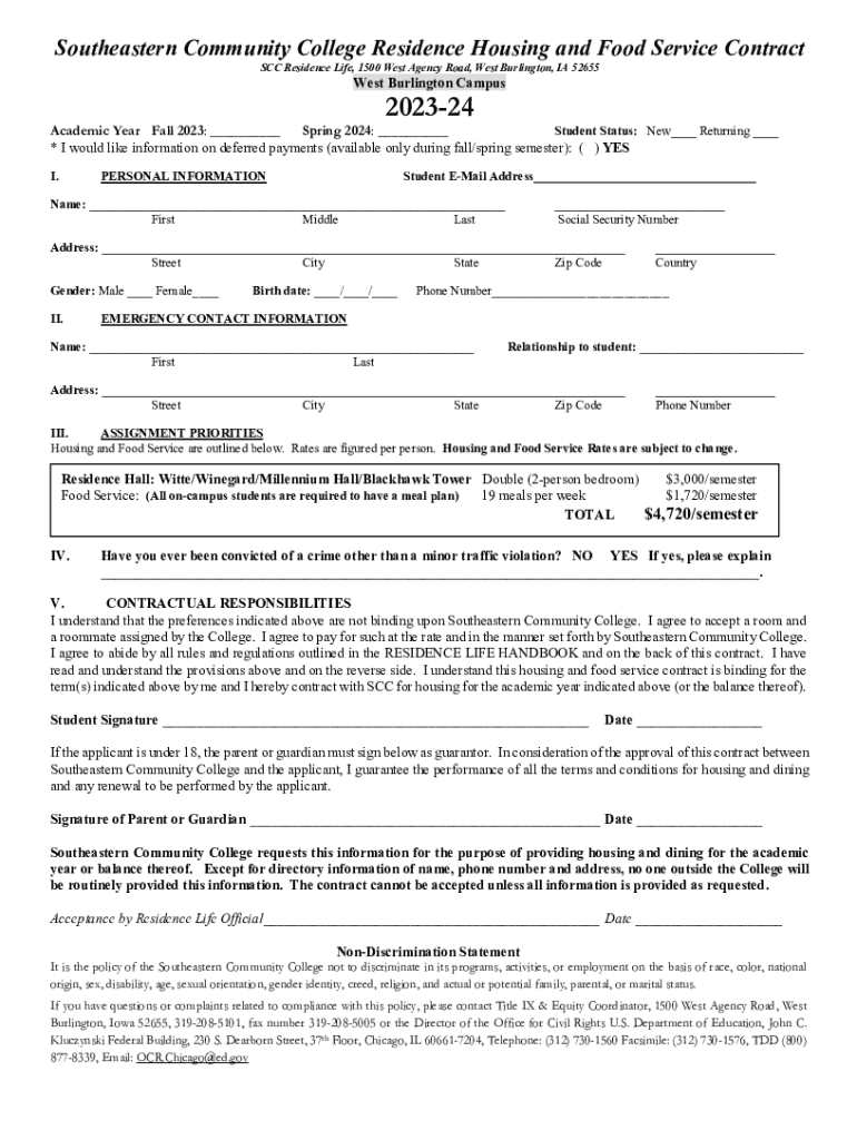 Southeastern Community College Residence Housing and Food Service Contract SCC Residence Life, 1500 West Agency Road, West Burlington, IA 52655West Burlington Campus202324Student Status: New___ Returning