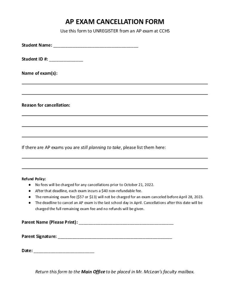 AP EXAM CANCELLATION FORM Use this form to UNREGISTER from an AP exam at CCS Student Name: ___ Student ID #: ___ Name of exam(s):Reason for cancellation:If there are AP exams you are still planning