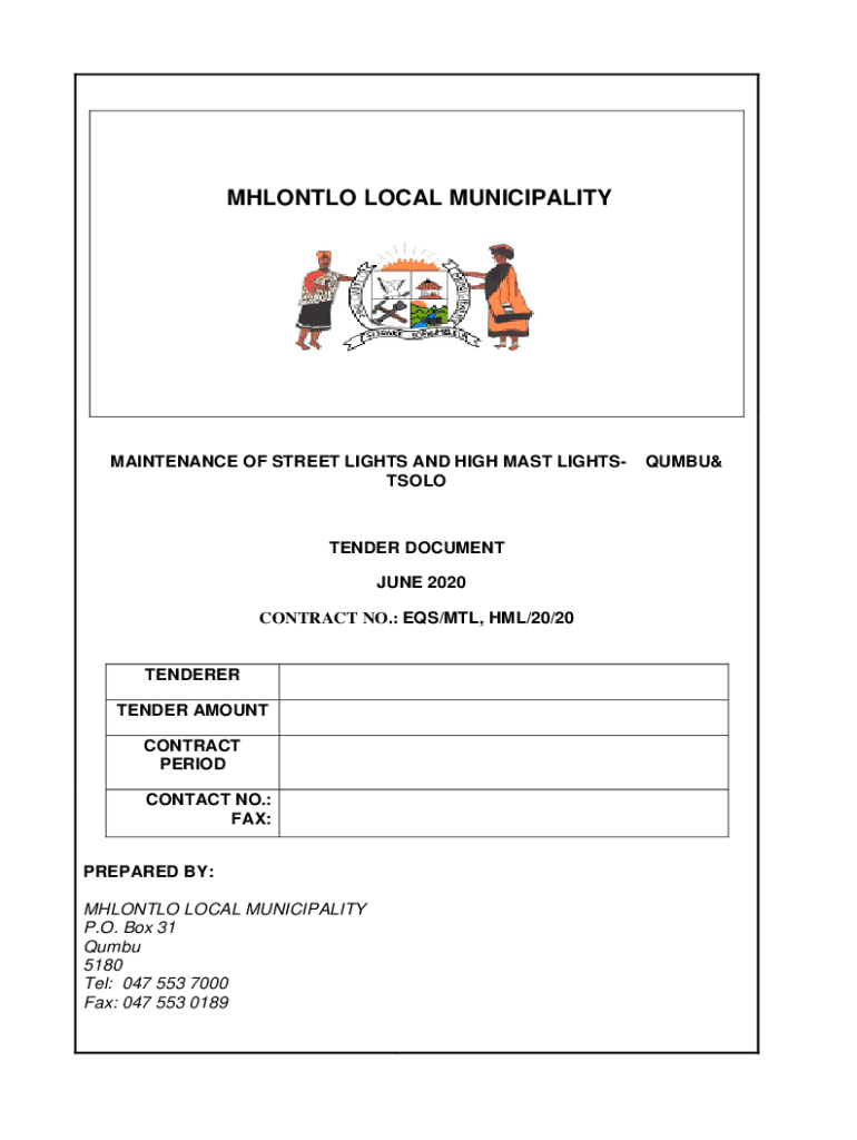 MHLONTLO LOCAL MUNICIPALITYMAINTENANCE OF Streetlights AND HIGH MAST LIGHTSTSOLOTENDER DOCUMENT