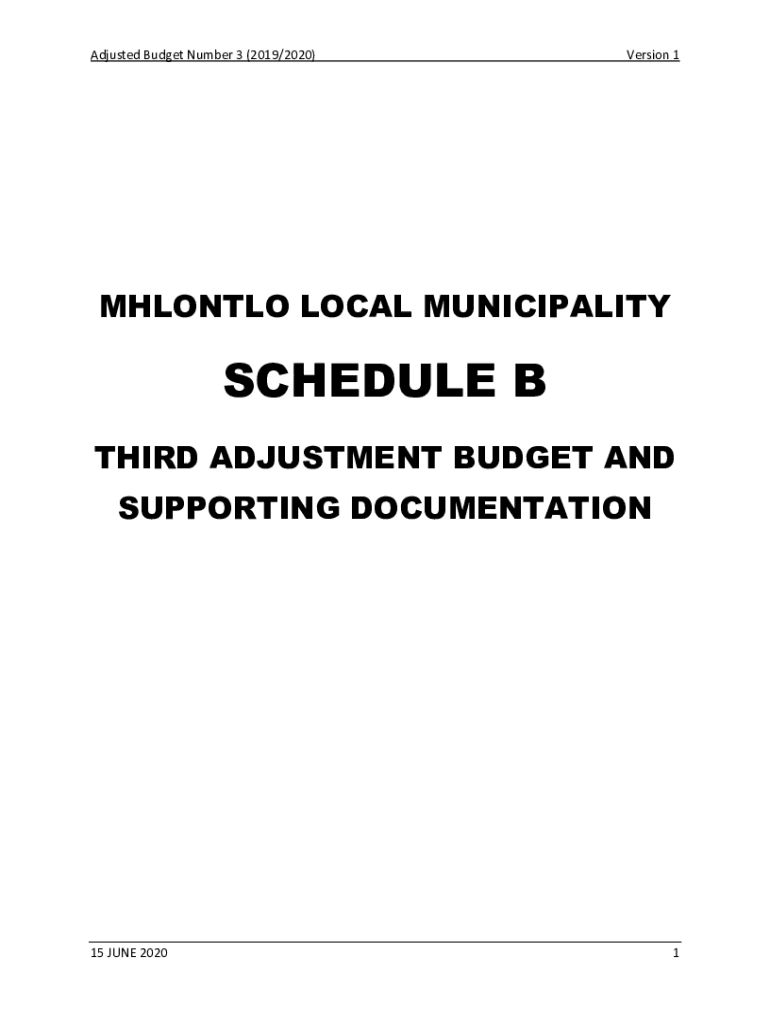 Adjusted Budget Number 3 (2019/2020)Version 1MHLONTLO LOCAL MUNICIPALITYSCHEDULE B THIRD ADJUSTMENT BUDGET AND SUPPORTING DOCUMENTATION15 JUNE 20201ADJUSTED BUDGET OFMHLONTLO LOCAL MUNICIPALITY2019/2020Copies