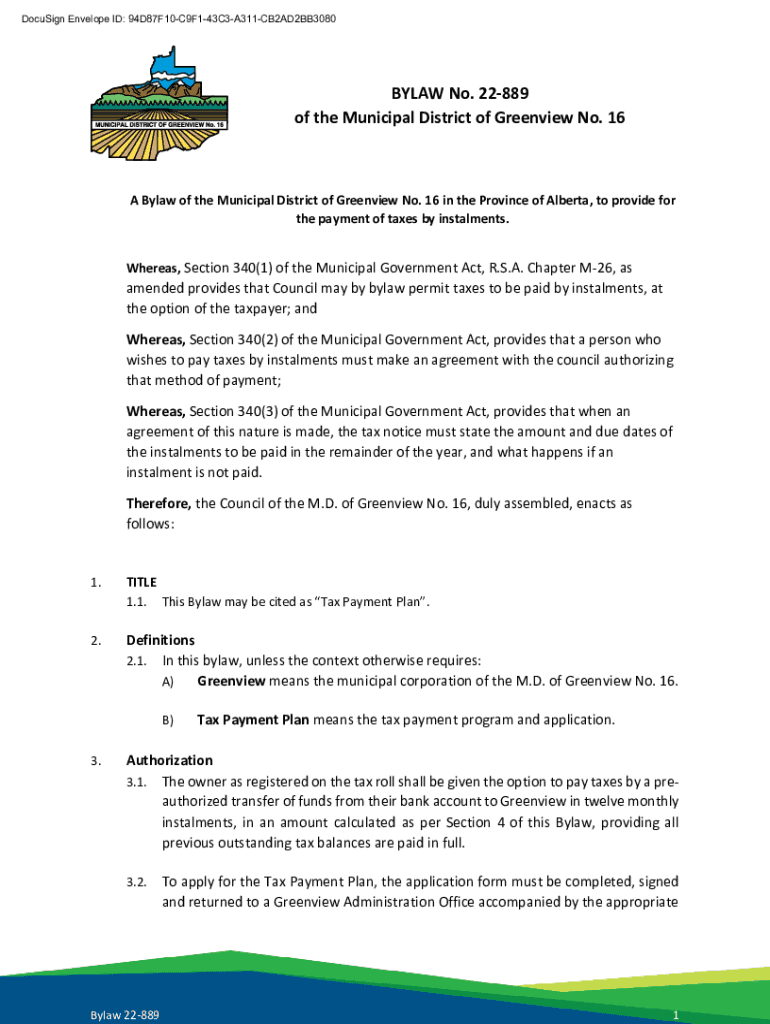 DocuSign Envelope ID: 94D87F10C9F143C3A311CB2AD2BB3080BYLAW No. 22889 of the Municipal District of Green view No. 16A Bylaw of the Municipal District of Green view No. 16 in the Province of Alberta,