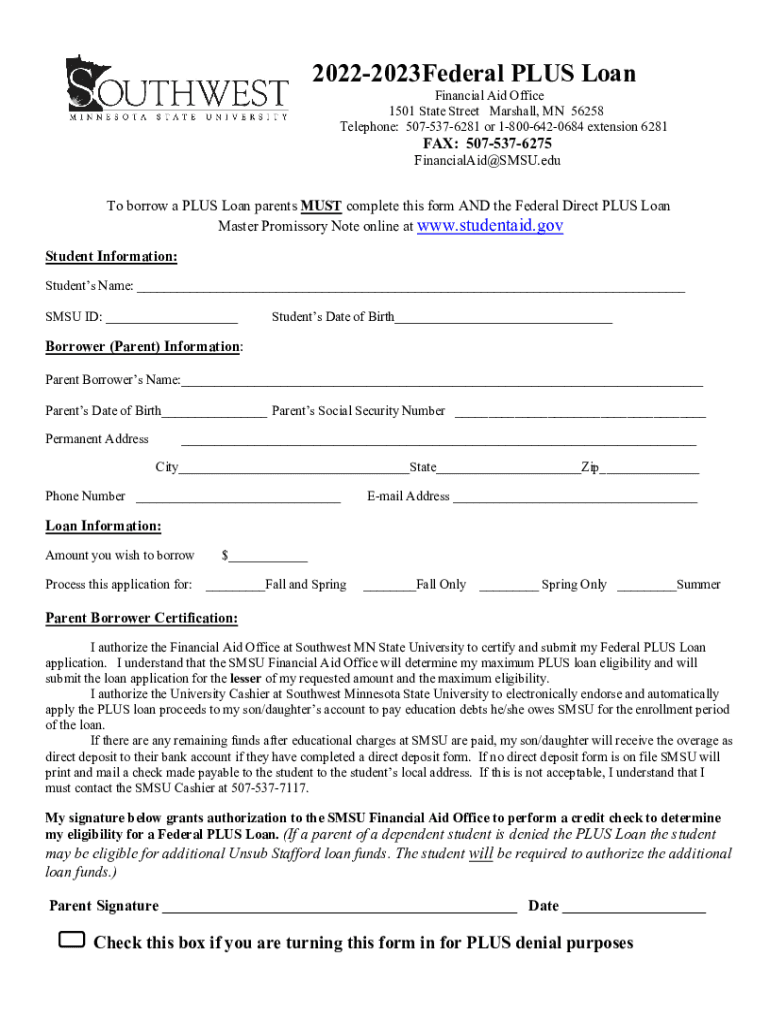 20222023Federal PLUS LoanFinancial Aid Office 1501 State Street Marshall, MN 56258 Telephone: 5075376281 or 18006420684 extension 6281FAX: 5075376275FinancialAid@SMSU.eduTo borrow a PLUS Loan parents